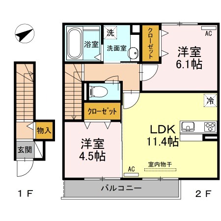| 間取り詳細 | LDK 11.4畳 、 洋室 6.1畳 、 洋室 4.5畳 |