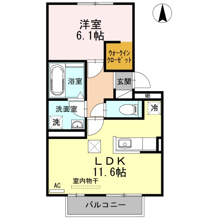| 間取り詳細 | LDK 11.6畳 、 洋室 6.1畳 |