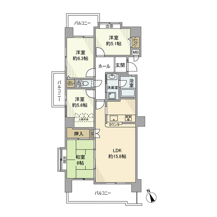 | 間取り詳細 | LDK 15.8畳 、 洋室 5.1畳 、 洋室 5.6畳 、 洋室 6.3畳 、 和室 6畳 |