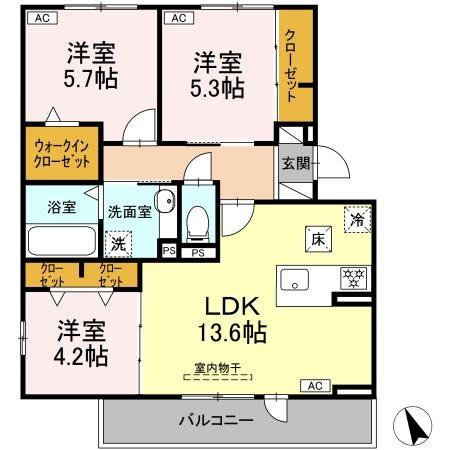 | 間取り詳細 | LDK 13.6畳 、 洋室 4.2畳 、 洋室 5.3畳 、 洋室 5.7畳 |