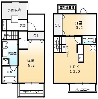 | 間取り詳細 | LDK 13畳 、 洋室 5.2畳 、 洋室 6.2畳 |