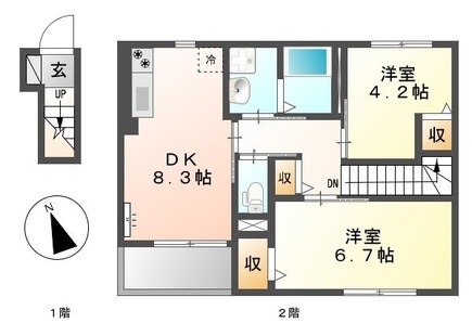 | 間取り詳細 | 洋室 4.2畳 、 洋室 6.7畳 、 DK 8.3畳 |